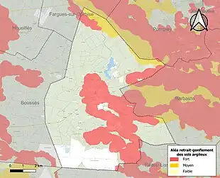 Le retrait-gonflement des sols argileux est susceptible d'engendrer des dommages importants aux bâtiments en cas d’alternance de périodes de sécheresse et de pluie[22]. 33,9 % de la superficie communale est en aléa moyen ou fort (91,8 % au niveau départemental et 48,5 % au niveau national)[Carte 2]. Depuis le , en application de la loi ELAN, différentes contraintes s'imposent aux vendeurs, maîtres d'ouvrages ou constructeurs de biens situés dans une zone classée en aléa moyen ou fort[Note 4],[23].