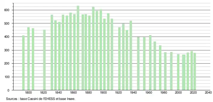 L'évolution du nombre d'habitants est connue à travers les recensements de la population effectués dans la commune depuis 1793. Pour les communes de moins de 10 000 habitants, une enquête de recensement portant sur toute la population est réalisée tous les cinq ans, les populations légales des années intermédiaires étant quant à elles estimées par interpolation ou extrapolation[25]. Pour la commune, le premier recensement exhaustif entrant dans le cadre du nouveau dispositif a été réalisé en 2007[26].