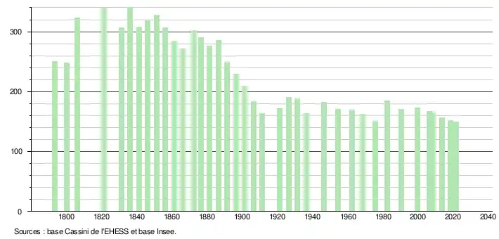 L'évolution du nombre d'habitants est connue à travers les recensements de la population effectués dans la commune depuis 1793. Pour les communes de moins de 10 000 habitants, une enquête de recensement portant sur toute la population est réalisée tous les cinq ans, les populations légales des années intermédiaires étant quant à elles estimées par interpolation ou extrapolation[19]. Pour la commune, le premier recensement exhaustif entrant dans le cadre du nouveau dispositif a été réalisé en 2008[20].