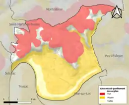 Le retrait-gonflement des sols argileux est susceptible d'engendrer des dommages importants aux bâtiments en cas d’alternance de périodes de sécheresse et de pluie. 81,2 % de la superficie communale est en aléa moyen ou fort (67,7 % au niveau départemental et 48,5 % au niveau national). Sur les 595 bâtiments dénombrés sur la commune en 2019, 461 sont en aléa moyen ou fort, soit 77 %, à comparer aux 72 % au niveau départemental et 54 % au niveau national. Une cartographie de l'exposition du territoire national au retrait gonflement des sols argileux est disponible sur le site du BRGM[22],[Carte 2].