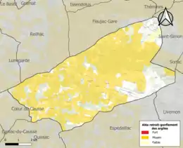 Le retrait-gonflement des sols argileux est susceptible d'engendrer des dommages importants aux bâtiments en cas d’alternance de périodes de sécheresse et de pluie. 70,8 % de la superficie communale est en aléa moyen ou fort (67,7 % au niveau départemental et 48,5 % au niveau national). Sur les 125 bâtiments dénombrés sur la commune en 2019, 74 sont en aléa moyen ou fort, soit 59 %, à comparer aux 72 % au niveau départemental et 54 % au niveau national. Une cartographie de l'exposition du territoire national au retrait gonflement des sols argileux est disponible sur le site du BRGM[31],[Carte 2].