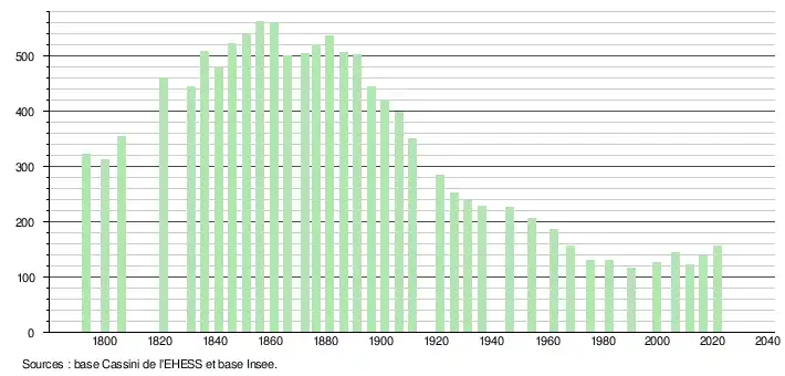 L'évolution du nombre d'habitants est connue à travers les recensements de la population effectués dans la commune depuis 1793. Pour les communes de moins de 10 000 habitants, une enquête de recensement portant sur toute la population est réalisée tous les cinq ans, les populations légales des années intermédiaires étant quant à elles estimées par interpolation ou extrapolation[39]. Pour la commune, le premier recensement exhaustif entrant dans le cadre du nouveau dispositif a été réalisé en 2006[40].