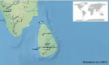 Cette espèce est endémique du Sud-Ouest du Sri Lanka[1]. Elle se rencontre entre 50 et 460 m d'altitude dans le massif Central et les monts Rakwana.