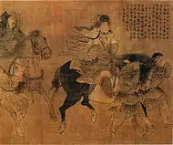 Les historiens chinois contemporains attribuent les succès des Jürchens contre les dynasties Liao et Song à leur cavalerie. Dès le début de la rébellion d'Aguda contre la dynastie Liao, tous les combattants Jurchen sont des cavaliers. Selon les chroniques de l'époque, les tactiques de la cavalerie Jurchen sont basées sur leur techniques de chasse[44]. Les cavaliers Jurchen bénéficient de la protection d'une armure lourde et en certaines occasions, ils utilisaient plusieurs chevaux attachés ensemble par une chaine (Guaizi Ma)[44].