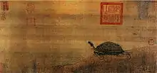 ![]() Tortue Divine. Vers 1156-1161, Zhang Gui, peintre de la dynastie des Jin. Encre et couleurs légères sur soie. H 26,5 × L 53,3 cm. Musée national du Palais, (Cité interdite), Pékin. |