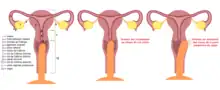 - les dyspareunies post-ménopause, qui se manifestent à la ménopause[9] ou après celle-ci ou post-partum (qui suivent un accouchement)[10],[11] (une enquête faite au Centre Hospitalier Universitaire d'Angers par des questionnaires anonymes distribués à 2 et 6 mois du post-partum a montré que 57 % des femmes qui ont répondu éprouvaient des douleurs au moment de la reprise de la sexualité après une naissance[11]). Les complications d'une épisiotomie en sont l'une des causes possibles, éventuellement à long terme[12] ;