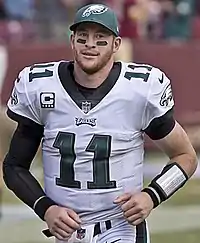 Lors de la saison 2017, les Eagles enregistrent un bilan de 13 victoires pour 3 défaites dont une série de 9 victoires consécutives entre la 3e et la 12e semaine[72]. Ils remportent le titre de la division NFC East et accèdent à la phase finale de la NFL pour la première fois depuis la saison 2013. En 14e semaine contre les Rams de Los Angeles, le quarterback titulaire Carson Wentz quitte le match à la suite d'une déchirure au ligament croisé antérieur. Il est remplacé par Nick Foles jusqu'au terme de la saison. Il dispute son premier match contre les Giants de New York en 15e semaine et l'emporte 34-29 en ayant inscrit cinq touchdowns à la passe. Foles est moins performant lors des deux derniers matchs de la saison contre les Raiders d'Oakland (victoire 19-10) et les Cowboys de Dallas (défaite 3-13)[73].
