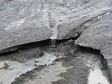L'eau de fonte joue également un rôle de lubrifiant dans le glissement basal des glaciers. Les mesures GPS de l'écoulement de la glace ont révélé que les mouvements glaciaires sont plus importants en été, lorsque les niveaux d'eau de fonte sont les plus élevés[2].