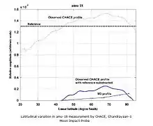Le 14 novembre 2008, l'engin spatial indien Chandrayaan-1 de l'ISRO lance le Moon Impact Probe (MIP) sur le cratère de Shackleton, situé au pôle Sud lunaire, dans le but d'analyser les débris dispersés par l'explosion en quête de présence de glace d'eau. Pendant sa chute d'une durée de 25 minutes, le Chandra's Altitudinal Composition Explorer (CHACE), intégré dans le MIP, enregistre des preuves de la présence d'eau grâce aux données de la spectrométrie de masse recueillies dans la fine couche d'atmosphère à la surface lunaire ainsi que dans les raies d'absorption d'hydroxyle des rayons du Soleil réfléchis[28],[29].