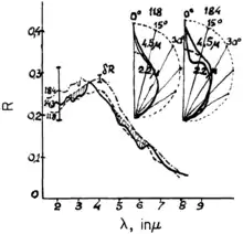 - En février 1978, des scientifiques soviétiques, qui analysent des carottes de sol lunaire prélevés par la sonde spatiale soviétique Luna 24 dans la mer des Crises à des profondeurs de 118, 143 et 184 cm, confirment la présence d'eau dans ces échantillons[9],[10]. Les échantillons ramenés sur Terre ont une concentration massique d'eau de 0,1. Cette concentration concorde avec les résultats des observations provenant de la spectroscopie d'absorption infrarouge (à une longueur d'onde d'environ 3 μm) à un niveau de détection qui est approximativement 10 fois au-dessus de son seuil[9],[10]. Les mesures spectrales montrent ainsi des minimums aux alentours de 3, 5, et 6 µm, des valeurs distinctes du spectre infrarouge des vibrations de valence de l'eau, avec des intensités de deux à trois fois plus grandes que le niveau de bruit[11]. Ces informations sont d'abord publiées dans la revue Geokhimilia, puis traduites en anglais et publiées l'année suivante dans Geochemistry International[12].