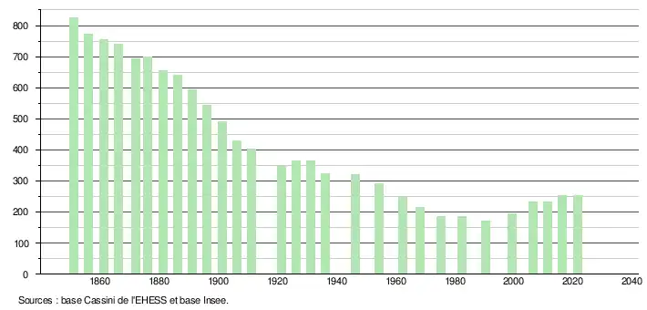 L'évolution du nombre d'habitants est connue à travers les recensements de la population effectués dans la commune depuis 1851. Pour les communes de moins de 10 000 habitants, une enquête de recensement portant sur toute la population est réalisée tous les cinq ans, les populations légales des années intermédiaires étant quant à elles estimées par interpolation ou extrapolation[18]. Pour la commune, le premier recensement exhaustif entrant dans le cadre du nouveau dispositif a été réalisé en 2006[19].