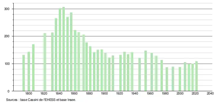 L'évolution du nombre d'habitants est connue à travers les recensements de la population effectués dans la commune depuis 1793. Pour les communes de moins de 10 000 habitants, une enquête de recensement portant sur toute la population est réalisée tous les cinq ans, les populations légales des années intermédiaires étant quant à elles estimées par interpolation ou extrapolation[30]. Pour la commune, le premier recensement exhaustif entrant dans le cadre du nouveau dispositif a été réalisé en 2006[31].