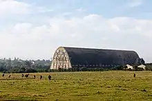 - Hangar à dirigeables (1917) classé monument historique[35]. Construit lors de la Première Guerre mondiale, il fut achevé en 1919. Initialement prévu pour abriter des dirigeables de la Marine nationale chargés de surveiller les sous-marins opérant en Manche, le développement de l'aviation rendit caduque cette utilisation. Il servit d'entrepôt pendant la Seconde Guerre mondiale[36]. Du matériel pour sous-marins fut entreposé jusqu'en 1994. En 1999, la Marine le remit à une association.