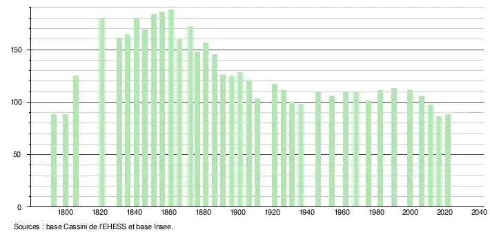 L'évolution du nombre d'habitants est connue à travers les recensements de la population effectués dans la commune depuis 1793. Pour les communes de moins de 10 000 habitants, une enquête de recensement portant sur toute la population est réalisée tous les cinq ans, les populations légales des années intermédiaires étant quant à elles estimées par interpolation ou extrapolation[22]. Pour la commune, le premier recensement exhaustif entrant dans le cadre du nouveau dispositif a été réalisé en 2006[23].