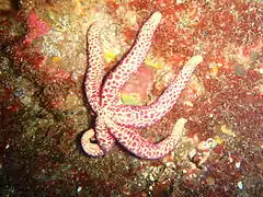 C'est une étoile régulière, constituée d'un disque central assez réduit autour duquel rayonnent 5 longs bras cylindriques beige pâle, recouverts de touffes de papules roses ou orangées.