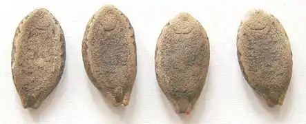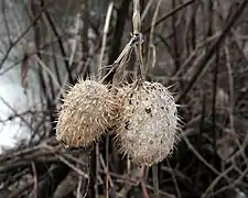 Le fruit est une capsule charnue et oblongue qui mesure de 2,5 à 5 cm de longueur. Lorsque le fruit est encore vert, il ressemble à un petit melon un peu piquant. Une fois mature, le fruit se dessèche et s'ouvre à son sommet pour libérer 4 graines mesurant entre 15 et 18 mm qui sont relativement lourdes, brun foncé, plates et rugueuses[7]. La capsule sèche et vide ressemble à un petit sac en maille épineux persistant pendant l'hiver après le plant[6],[8].