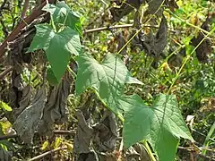 Les feuilles, généralement opposées, sont longuement pétiolées et elles sont habituellement découpées en 5 lobes profonds à bord lisse ou finement dentées[6].