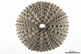 C'est un oursin régulier de taille moyenne, dont le test (coquille) mesure entre 5 et 8 cm de diamètre. Le test est généralement noir, et la couleur de ses radioles robustes et coniques est variable, allant du violacé au noir. Celles-ci sont de longueur homogène, ne dépassant pas le diamètre du test. La bouche située au centre de la face orale (inférieure), et l'anus à l'opposé, à l'apex (pôle supérieur). Le péristome (membrane charnue entourant la bouche) est large et nu. Contrairement aux autres espèces de son genre, cet oursin n'est pas significativement allongé et plutôt circulaire.