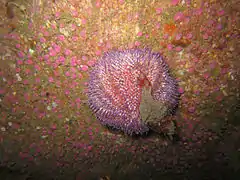 C'est un gros oursin régulier de forme globulaire, avec des radioles (les piquants) nombreuses, courtes et serrées, mais laissant apparaître des zones ambulacraires plus claires. Le test (coquille) apparaît d'ordinaire rouge ou rosâtre, et les piquants peuvent prendre différentes couleurs allant du violet pâle au vert foncé en passant par le rose[1]. Les podia sont nombreux et charnus, généralement bien visibles. Le test peut atteindre un diamètre maximal de 17 cm[2], et les piquants dépassent rarement 2 cm de longueur[3].