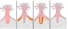 Schéma présentant le processus de construction du squelette sur un corail dur. Une première extension verticale se fait, puis vient une extension latérale au fond de la corallite.