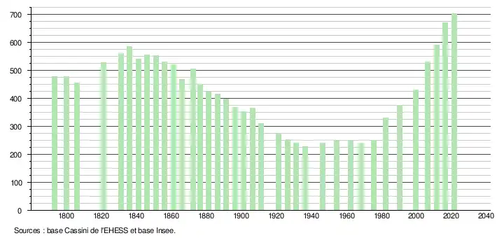 L'évolution du nombre d'habitants est connue à travers les recensements de la population effectués dans la commune depuis 1793. Pour les communes de moins de 10 000 habitants, une enquête de recensement portant sur toute la population est réalisée tous les cinq ans, les populations légales des années intermédiaires étant quant à elles estimées par interpolation ou extrapolation[22]. Pour la commune, le premier recensement exhaustif entrant dans le cadre du nouveau dispositif a été réalisé en 2006[23].