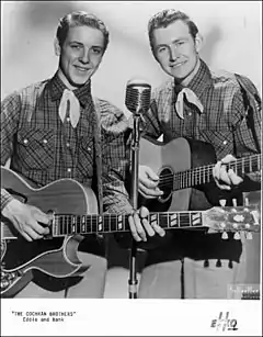Eddie et Hank commencent à se produire en duo sous le nom de Cochran Brothers (« les frères Cochran »). Bien qu'ils portent le même nom de famille, ils ne sont pas parents, mais se ressemblent suffisamment pour faire illusion. Cliffie Stone, l'un des patrons de l'agence Americana Music, avec Tennessee Ernie Ford et Steve Stebbins, leur trouve des engagements, mais Eddie est encore trop jeune pour avoir le droit de se produire loin de son domicile. Les Cochran Brothers jouent au Town Hall Party et au Hometown Jamboree, émissions influentes. Au printemps 1955, Eddie quitte l'école pour se consacrer à la musique. Steve Stebbins présente Chuck Matthews au duo. Directeur artistique et copropriétaire du label Ekko et des éditions Old Judge, c'est également un compositeur qui signe parfois sous le pseudonyme de Red Hews. Matthews aide les Cochran Brothers à peaufiner leur répertoire et leur présentation. Le duo enregistre deux 45 tours de country en aux studios Western Recorders de Hollywood : Mr. Fiddle / Two Blue Singin' Stars (Ekko 1003) et Guilty Conscience / Your Tomorrows Never Come (Ekko 1005).