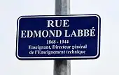 Edmond Labbé ( à Paris[1]- à Yvetot) est un enseignant et premier directeur général du sous-secrétariat d'État à l'enseignement technique en 1920. Il est un des fondateurs de l'AFDET (Association Française pour le Développement de l'Enseignement Technique), dont Edouard Herriot, président de l'AFDET de 1930 à 1952, s'adressant à lui lors de la fête en son honneur lors de son départ à la retraite, déclara : « La résurrection de l'enseignement technique, c'est votre œuvre ; ce n'est pas l'œuvre d'un autre, c'est votre création. C'est vous qui avez donné vie à cet enseignement et qui l'avez mis dans un tel état qu'à l'heure actuelle, il est à l'abri de tout danger[2]».