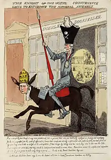 Edmund Burke est ici représenté comme un Don Quichotte, s'appuyant sur le pape, représenté comme un âne. La caricature paraît en 1790, au moment de la Constitution civile du clergé en France et de la sortie du livre de Burke Reflections on the Revolution in France. Burke sort d'un porche au-dessus duquel est inscrit le nom de son éditeur, Dodsley Bookseller. Sur son bouclier, la Bastille. Autour du cou un médaillon portant le profil de la reine Marie-Antoinette.
