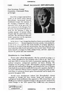 Edouard Chevardnadze (géorgien : ედუარდ შევარდნაძე), avec le patronyme Amvrossievitch en russe (Эдуард Амвросьевич Шеварднадзе), né le à Mamati (Géorgie) et mort le à Tbilissi[1], est un homme d'État soviétique et géorgien. Il a été ministre des Affaires étrangères de l'Union soviétique de 1985 à 1990 puis président de Géorgie de 1992 à 2003.