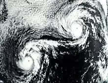 Le système binaire Ione (gauche) et Kirsten en rotation dans le Pacifique-est durant la saison cyclonique 1974