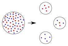 À gauche, une population globale, diffusant à droite vers trois possibilités de populations fondatrices