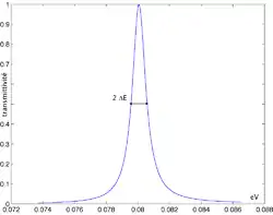 La figure ci-contre montre la transmittivité de la barrière, obtenue par un balayage en énergie. La courbe épouse la forme caractéristique des lorentziennes, propre aux résonances. La mise en évidence des aspects temporels peut s'observer si l'on suit un paquet d'onde, associé à une particule incidente, venant de la gauche, dont le spectre en énergie recouvre la courbe de résonance.