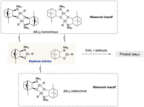 La réaction asymétrique du dialkylzinc et du benzaldéhyde en présence du ligand chiral (-)-3-exo-(diméthylamino)isobornéol (nommé DAIB) présente des phénomènes non linéaires inhabituels ayant fait l'objet de nombreuses études mécanistiques. En présence d'une quantité catalytique de DAIB, la réaction du dialkylzinc et d'un aldéhyde aromatique est nettement accélérée pour donner, après hydrolyse, l'alcool correspondant avec une très grande pureté énantiomérique (figure 11a). L'étude de l'excès énantiomérique du produit en fonction de l'excès énantiomérique du ligand [eeP = f(eeL)] donne un effet non linéaire positif très marqué comme le montre la figure 11b. Par exemple pour R = Et, un excès énantiomérique de 95 % pour le produit est obtenu avec un ligand ayant uniquement 15 % d'excès énantiomérique.