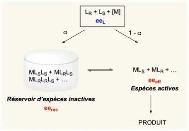 Si le ligand chiral utilisé possède un excès énantiomérique eeL (0 < eeL < 100) pour générer un catalyseur, il est possible qu’une partie du catalyseur soit piégé sous forme d’espèces inactives (le réservoir). Soit α, la fraction de ces complexes non impliqués dans le cycle catalytique. Cette fraction α possédera un excès énantiomérique noté eeres (res pour réservoir). Si α ≠ 0 et eeres ≠ eeL, cela modifiera l’excès énantiomérique du ligand engagé dans le cycle catalytique. Le eeL sera modifié, il donnera un excès énantiomérique efficace noté eeeff. La figure 2 résume la situation.