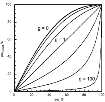 « Ce ne sera pas le cas pour les réactions présentant des effets non linéaires. »[3] Une énantiosélectivité supérieure (ou inférieure) à la valeur proportionnelle de l'excès énantiomérique du catalyseur est considérée comme un comportement non usuel. Cet écart par rapport à la linéarité est appelé « effet non linéaire » ou « NLE »[4].