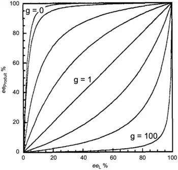 Un exemple intéressant avec le modèle ML3 est décrit sur la figure 9. Si l'espèce hétérochirale est plus réactive que l'espèce homochirale (grande valeur de g avec g = k3'/k3) et qu'elle induit un produit avec une meilleure énantiosélectivité (c'est-à-dire que ee'3 >> ee3) alors, il serait possible d'avoir un catalyseur plus efficace lorsqu'il n'est pas énantiopure. Si l'on prend les courbes de la figure 9, les paramètres ont été fixés à : ee3 = 50 % ee et ee'3 = 100 % ee, donc l'espèce hétérochirale induit une meilleure énantiosélectivité que l'espèce homochirale. Dès que g est significatif, la courbe montre une zone où le catalyseur est plus efficace sous une forme non énantiopure.