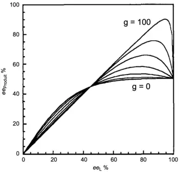 Pour une réaction asymétrique idéale, le eeProduit peut être décrit comme le produit de ee0 multiplié par le eeL (ee0 est la valeur de l'excès énantiomérique du produit obtenue avec le catalyseur énantiopur). Donc eeproduit = 0,9 × 0,5 = 0,45, soit 45 % ee.