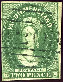 La Terre de van Diemen sur sa seconde émission de 1855 sous ce nom, puis à partir de 1858 à 1870 sous le nom de Tasmanie, emploie le portrait d'après Chalon gravé par W. Humphrys[11].