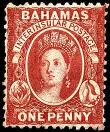 Le projet se dirige alors vers la gravure de l'effigie de la reine d'après le portrait de Chalon. À la demande du gouverneur, les deux productions bahaméennes sont ajoutées[13] : l'ovale de l'effigie s'en trouvant réduit, le collier porté par Victoria n'est pas visible sur le 1 penny carmin. Sous le nom « BAHAMAS » horizontal, une banderole indique l'usage de cette valeur : « INTERINSULAR POSTAGE » pour « port entre île ». La première livraison de timbres imprimés à Londres est mise en vente aux Bahamas le [14]. À partir de , ils sont dentelés, mais les perforations ne sont au point qu'après 1863, à raison de 14 trous aux deux centimètres[14].