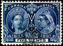 Au temps de la Confédération, pour le soixantième anniversaire du règne de la reine Victoria en 1897, l'effigie Chalon apparaît sur une série commémorative de grand format avec un second profil, plus âgé, d'après un portrait de Heinrich von Angeli de 1886[8]. Émise le , la série de seize timbres d'un demi-cent à cinq dollars provoque des critiques : seulement 75 000 timbres d'un demi-cent et 150 000 pour le six cents sont imprimés en raison d'un manque d'usage possible. Mais, face à la menace d'une spéculation, la poste canadienne ne vend ces deux valeurs que si l'acheteur se procure la série entière pour 16,205 dollars dont deux unités dépassent le tarif maximum de l'époque (3,59 dollars)[9].