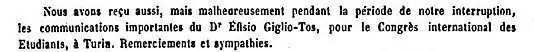 - Nelle seduto del suo primo Congresso internazionale espresse un voto inneggiante al trionfo delle nazionali aspirazioni di tutti i popoli, e Giglio Tos volle che un Triestina avesse a rappresentare la Sezione italiana ed un cittadino di Oradea Mare (Transilvania) fosse delegato della Sezione Romena (Congresso di Torino, 1898): cosi nel secondo Congesso tenutosi a Parigi nel 1900, ottene il riconoscimento delle Sezione nazionali: polacca, czeca e finnica.