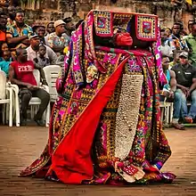 L'ensemble Egungun sert de support à la transformation du porteur en ses ancêtres. Une société Egungun est composée d'hommes et de femmes dont les lignées ont le droit de présenter le masque. Les hommes portent le déguisement. Les femmes ne portent jamais le costume, bien qu'elles participent au chœur qui chante les poèmes de louange oriki et les histoires des familles. Les femmes âgées, de haut titre, exécutent également des invocations, des prières et des offrandes. Lors des festivals annuels, chacune des nombreuses lignées se voit attribuer une journée distincte pour se produire. Le porteur est tenu à distance de la foule environnante avec l'aide de préposés, vêtus de costumes de déguisement de différents types. Une fois que tous les Egungun ont dansé, les ensembles sont conservés jusqu'à la prochaine représentation[5].