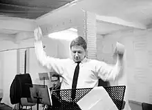 Eino Ruutsalo dirigeant l'enregistrement d'une musique d'un film dans son studio.