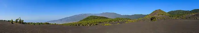 Le Llano del Jable, paysage volcanique dans la campagne de El Paso. On aperçoit le parc national de la Caldeira de Taburiente. Mars 2019.