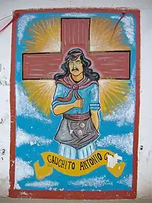 - Gauchito Gil : ce jeune et beau gaucho qui s'attira les foudres des maris trompés - comme celles des propriétaires fonciers exaspérés par l' abigéat coutumier, fut enrôlé de force dans la Guerre de la Triple Alliance (1864-1870). Lassé des combats, il déserta, fut repris, et condamné à avoir la gorge tranchée. La légende affirme qu’avant de mourir il avertit son bourreau que son fils était gravement malade, mais qu’il lui suffirait d’invoquer Gauchito Gil pour que l’enfant se rétablisse, ce qui arriva...Le culte de Gauchito Gil (qui rappelle le mythes d’Adonis et de Robin des Bois) se répandit rapidement loin de la province de Corrientes, et touche actuellement une grande partie de la population argentine. Dans les reportages filmés devant la clinique où Maradona était hospitalisé, des statues de Gauchito Gil sont visibles, brandies par les hinchas