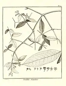 « TONTELEA ſcandens (Tabula 10.)Frutex caules plurimos, ſcandentes, longiflimos, ramoſos, e radice emittens ; ramis ſupra altiſſimas arbores latè ſparſis, ramuſculis longiſſimis propendentibus ; rami & ramuſculi oppoſiti ſunt.