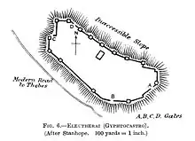 Eleutherae ( grec ancien : Ἐλευθεραί ) est une ville située dans la partie nord de l'Attique, bordant la Béotie. L'une des forteresses de la Grèce antique se dresse à l'emplacement d'un ancien château d'Eleutherae, daté entre 370 et 360 av. J.-C., avec des murs d'une épaisseur moyenne de 2,6 m. Un circuit de murailles de 860 m comportait des tours le long de la bordure nord du site dont 6 ont survécu, conservées sur une hauteur de 4 à 6 m. Les fondations de plusieurs tours sont visibles ainsi que la trace du reste des fortifications, ainsi que l'emplacement de la grande porte double (ouest) et de la petite porte (sud-est). Il y a deux petites sorties situés du côté nord. La zone fortifiée est irrégulière sur une surface de 113 × 290 m.