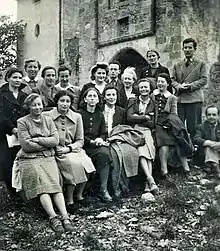 Réunion du personnel de la SAK[2] au château de la Hille en 1941 : Élisabeth Eidenbenz est debout, la troisième à partir de la gauche.
