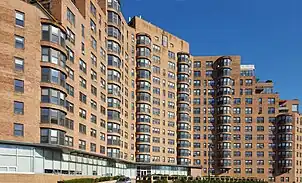 Haut de 14 étages, le bâtiment construit de béton et d'acier est revêtu de briques et contient des éléments inspirés à la fois de l'art déco et du style international.