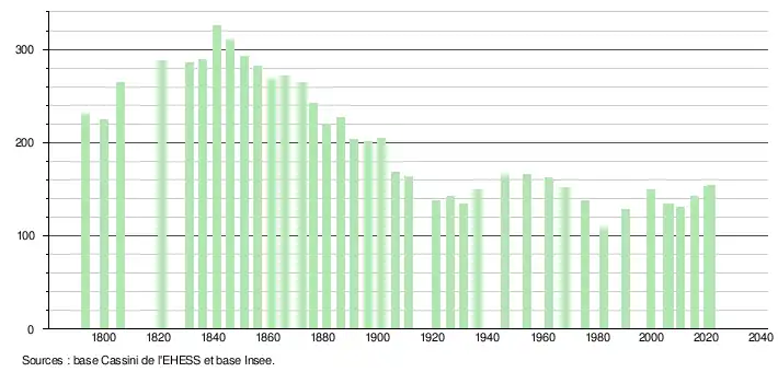 L'évolution du nombre d'habitants est connue à travers les recensements de la population effectués dans la commune depuis 1793. Pour les communes de moins de 10 000 habitants, une enquête de recensement portant sur toute la population est réalisée tous les cinq ans, les populations légales des années intermédiaires étant quant à elles estimées par interpolation ou extrapolation[26]. Pour la commune, le premier recensement exhaustif entrant dans le cadre du nouveau dispositif a été réalisé en 2005[27].